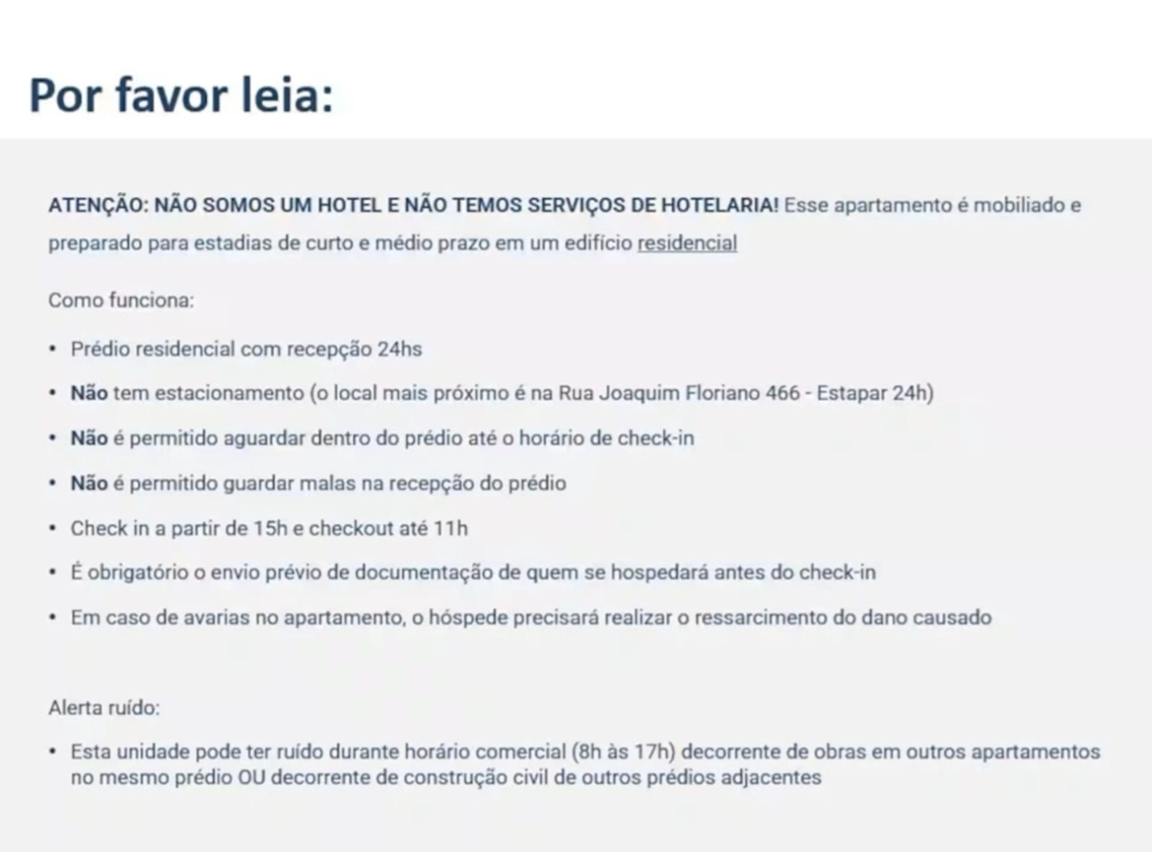 ✨ Studio moderno com 28m² na melhor localização do Itaim (Rua Joaquim Floriano 152), em condomínio de luxo novíssimo e moderno! 𝗦𝘁𝘂𝗱𝗶𝗼 𝗯𝗼𝘂𝘁𝗶𝗾𝘂𝗲: • Camal casal normal (não é queen) • Lençóis cama e toalhas padrão boutique • Cozinha completa • Wifi alta velocidade 𝗗𝗲𝘀𝘁𝗮𝗾𝘂𝗲𝘀: •...